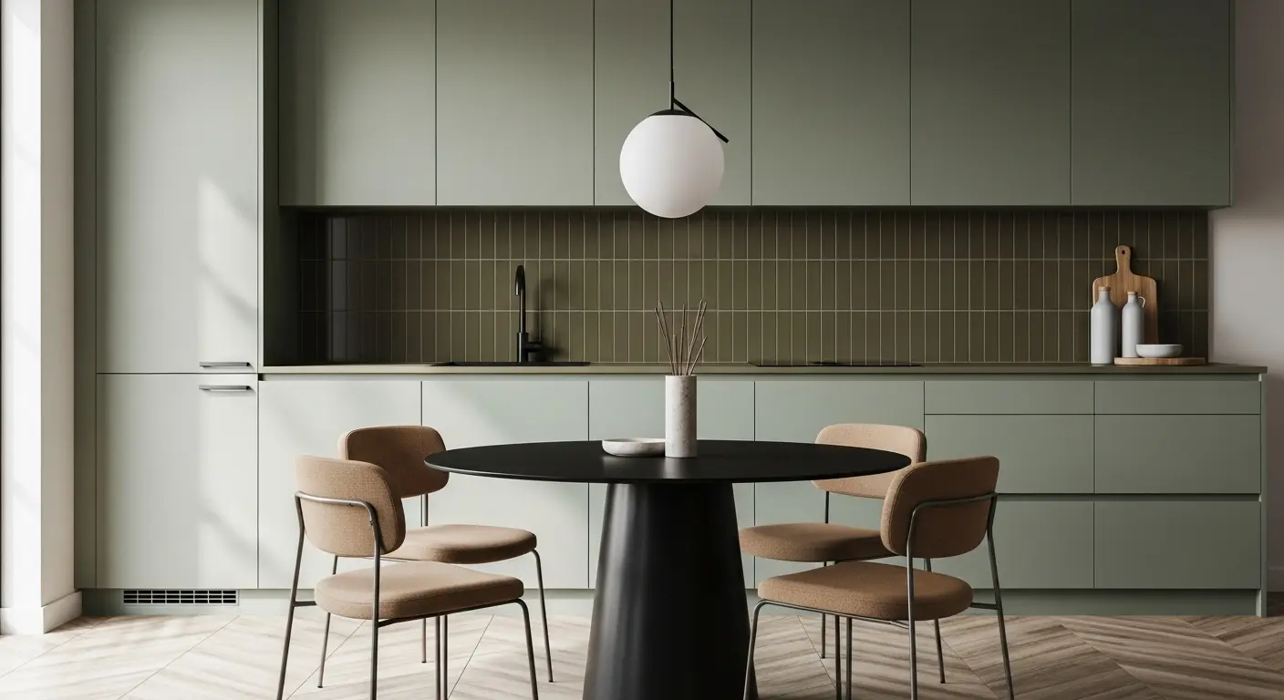 Salbeigrün als Hauptfarbe schafft eine entspannte, aber nicht langweilige Atmosphäre. Die schwarzen Akzente durch Armatur und Tisch sorgen für Definition, während die warmen Holztöne Gemütlichkeit vermitteln.