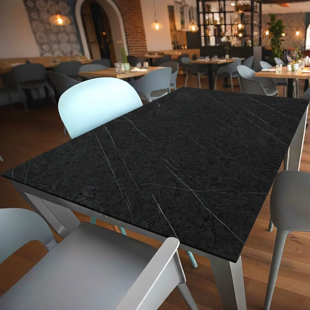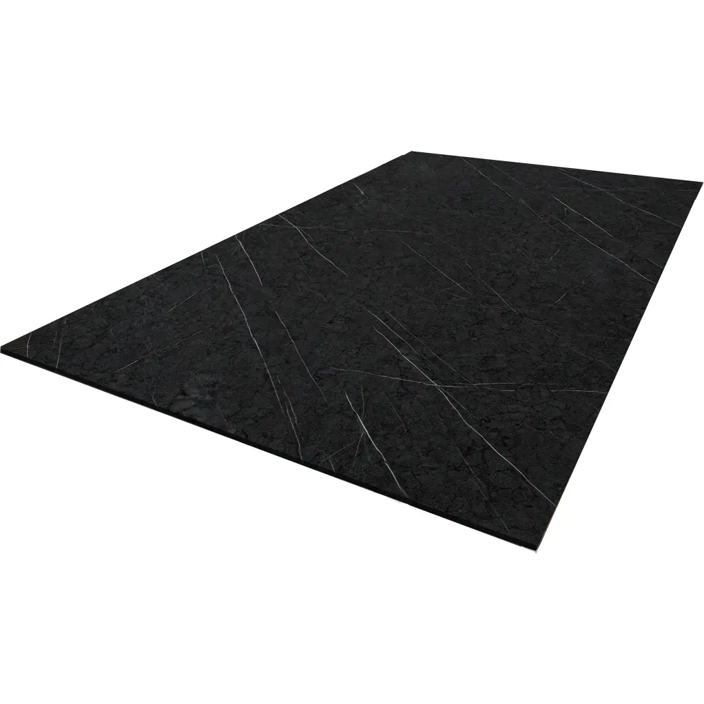 Die edle Steinoptik der dunklen Marmoroberfläche verbindet moderne Eleganz mit robuster Alltagstauglichkeit in Küchen, Büros, Hotels und Restaurants. Die HPL Fläche ist langlebig, feuchte- und hitzebeständig, hygienisch, stoßfest, leicht zu reinigen und ressourcenschonend. Anwendungen: Küchen- und Tischplatten, Workstations, Schrank- und Türfronten, Trennwände, Schul- und Bibliothekstische, Restaurant- und Hotelmöbel sowie modulare Küchen.