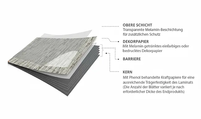 Extrem widerstandsfähige HPL Platte mit melaminharzgehärteter Oberfläche, dekorativem Dekorpapier und phenolharzverstärktem Kraftpapier-Kern für maximale Stabilität und Formtreue. Kratz- und chemikalienbeständig, wetter- und UV-resistent – ideal für Innen und Außen. Die Schichtstruktur aus Melamin-Overlay, Dekorpapier und einem unter Hochdruck verpressten Phenolharz-Kern sorgt für Härte, Biegesteifigkeit und langlebige Optik.